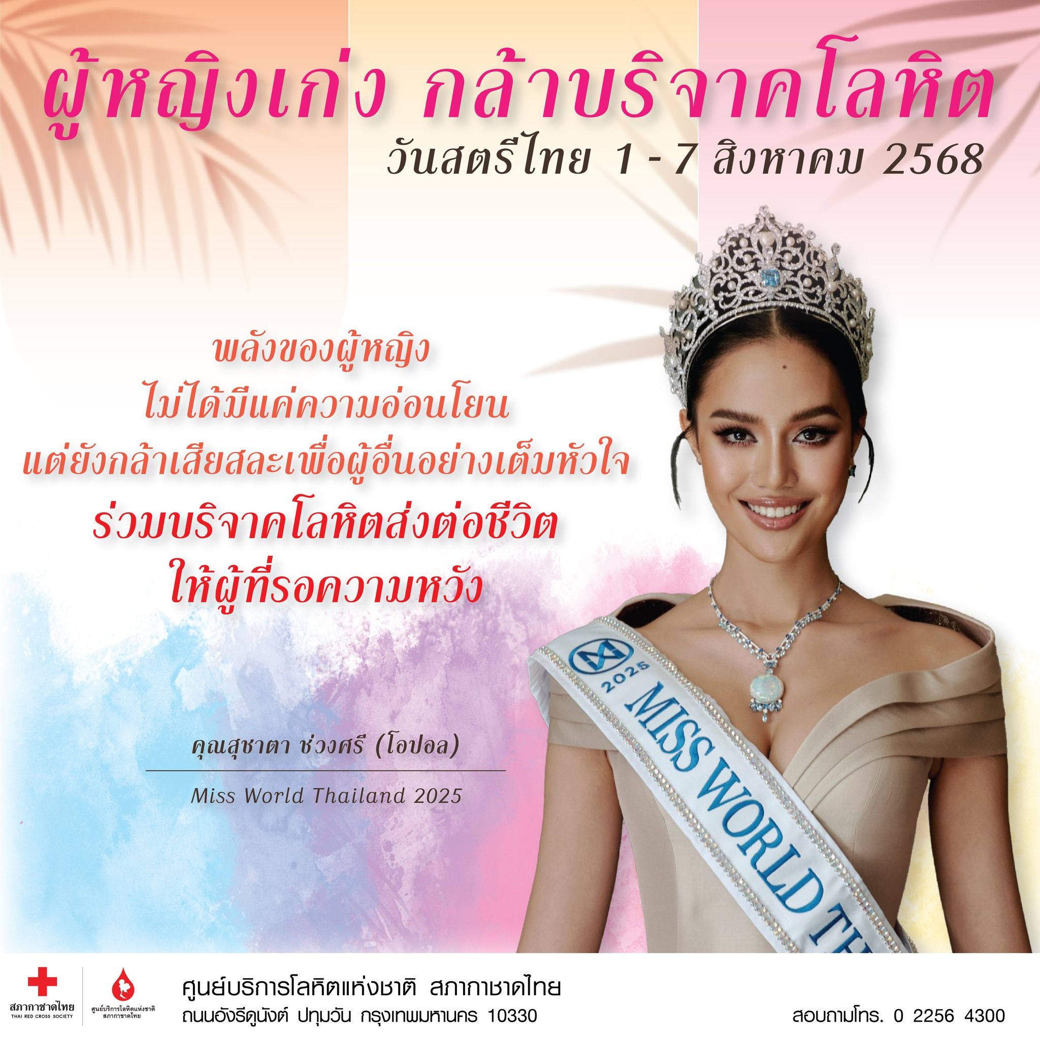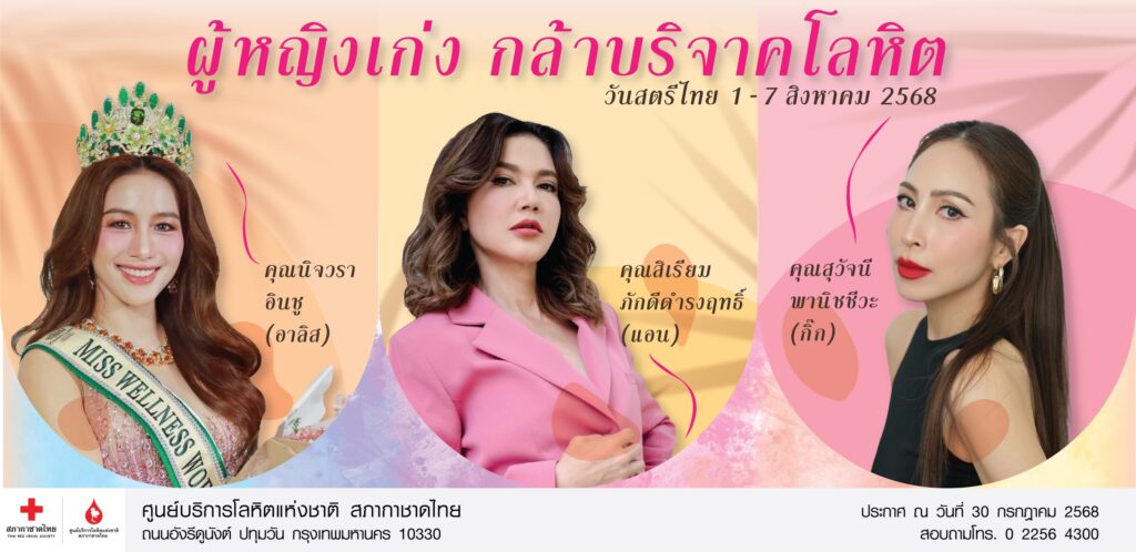 ศูนย์บริการโลหิตแห่งชาติ สภากาชาดไทย ชวนผู้หญิงเก่ง-กล้าทั่วประเทศ บริจาคโลหิตเนื่องในสัปดาห์วันสตรีไทย ระหว่างวันที่ 1 – 7 สิงหาคม 2568 ณ ศูนย์บริการโลหิตแห่งชาติ หน่วยรับบริจาคโลหิตประจำที่ 7 แห่ง (Fixed Station) และภาคบริการโลหิตแห่งชาติ 12 แห่งทั่วประเทศ