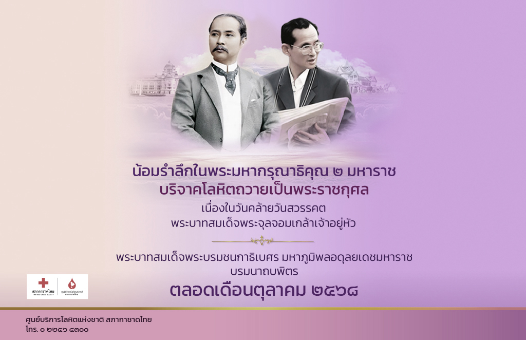 ศูนย์บริการโลหิตแห่งชาติ สภากาชาดไทย จึงขอเชิญชวนหน่วยงานภาครัฐ ภาคเอกชน พสกนิกรทุกหมู่เหล่าทั่วประเทศ ร่วมแสดงความจงรักภักดี บริจาคโลหิตถวายเป็นพระราชกุศล ในโครงการ“น้อมรำลึกในพระมหากรุณาธิคุณ 2 มหาราช” พระมหากษัตริย์ผู้ทรงอุทิศกำลังพระวรกายเพื่อความผาสุกของพสกนิกรชาวไทย และร่วมสืบสานพระราชปณิธานการทำความดีเพื่อแผ่นดินไทย ตลอดเดือนตุลาคม 2568 บริจาคโลหิต ได้ที่