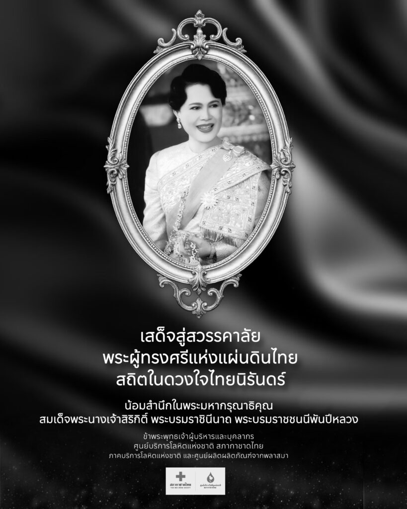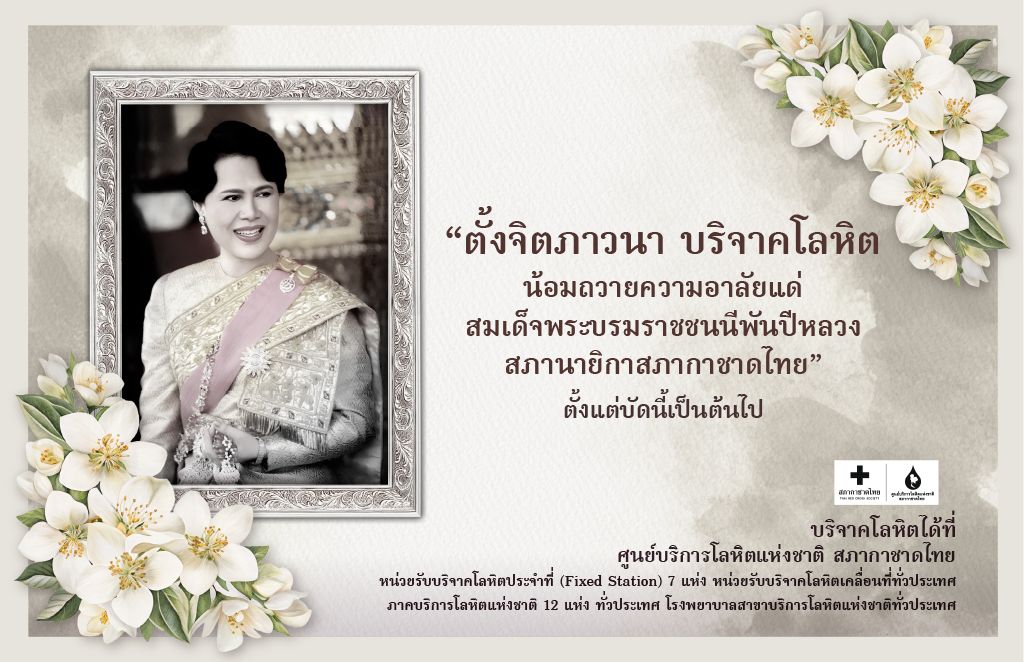 ศูนย์บริการโลหิตแห่งชาติ สภากาชาดไทย ขอเชิญพสกนิกรชาวไทยทุกหมู่เหล่า ร่วมแสดงออกถึงความจงรักภักดีและสำนึกในพระมหากรุณาธิคุณอันหาที่สุดมิได้ โดยการตั้งจิตภาวนาและบริจาคโลหิต เพื่อถวายเป็นพระราชกุศลแด่ สมเด็จพระนางเจ้าสิริกิติ์ พระบรมราชินีนาถ พระบรมราชชนนีพันปีหลวง สภานายิกาสภากาชาดไทย ผู้ทรงเสด็จสู่สวรรคาลัย ด้วยหัวใจเปี่ยมศรัทธาและอาลัยยิ่ง