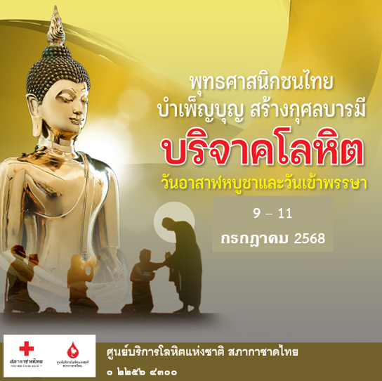 ศูนย์บริการโลหิตแห่งชาติ สภากาชาดไทย จึงได้จัดโครงการ“บำเพ็ญบุญ สร้างกุศลบารมี บริจาคโลหิต เนื่องในวันอาสาฬหบูชาและวันเข้าพรรษา” ระหว่างวันที่ 9-11 กรกฎาคม 2568 เพื่อเชิญชวนพุทธศาสนิกชนผู้ใจบุญ ร่วมบริจาคโลหิตสำรองคงคลังให้เพียงพอกับความต้องการของโรงพยาบาลต่างๆ ทั่วประเทศ สามารถบริจาคโลหิตได้เป็นประจำทุก 3 เดือน