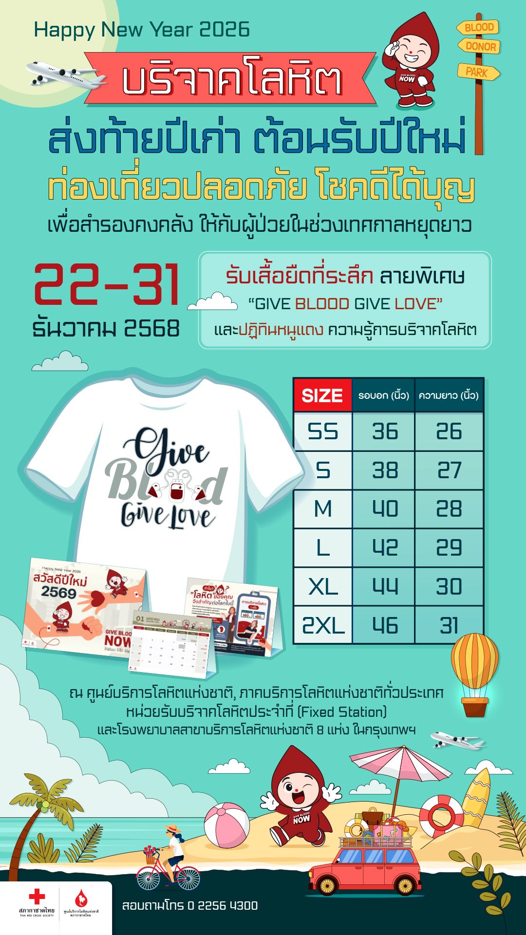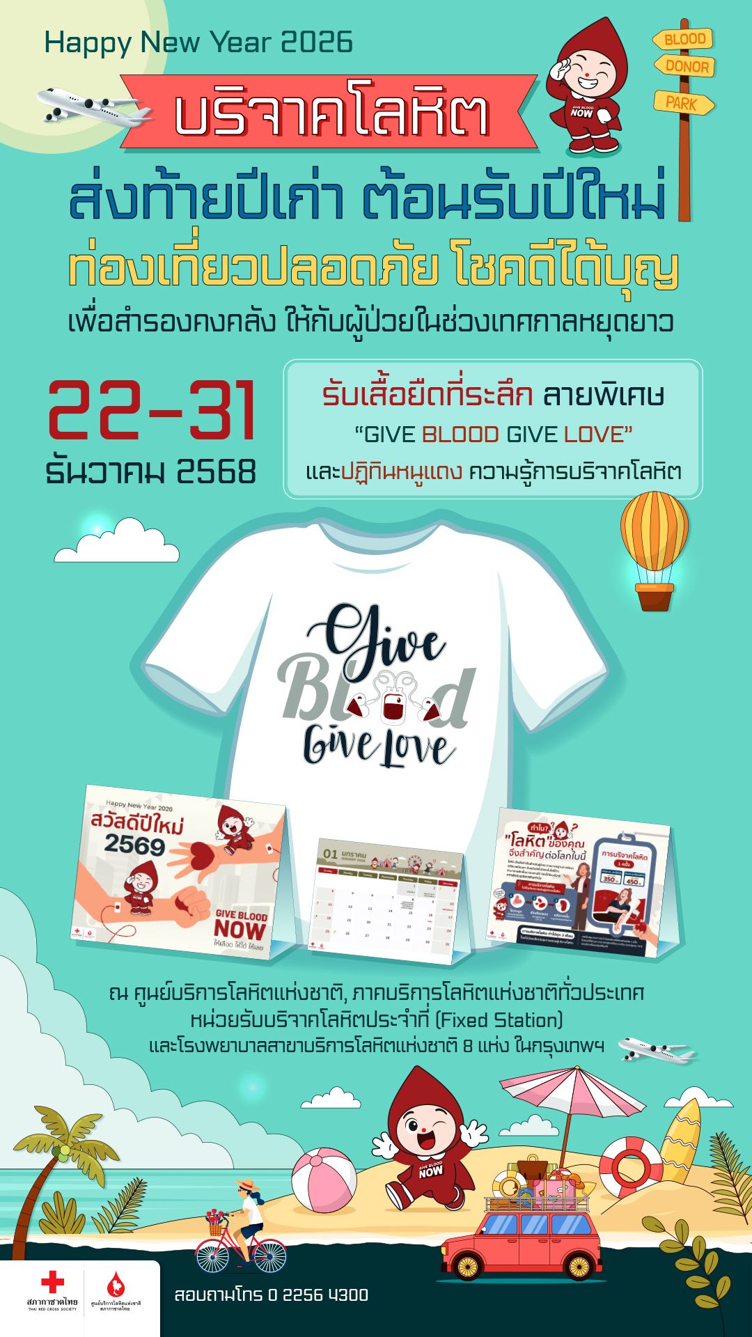 ศูนย์บริการโลหิตแห่งชาติ จึงขอเชิญชวนประชาชนทั่วประเทศ ร่วมบริจาคโลหิต ส่งท้ายปีเก่าต้อนรับปีใหม่ ท่องเที่ยวปลอดภัย โชคดีได้บุญ ระหว่างวันที่ 22 – 31 ธันวาคม 2568 (10 วัน) เพื่อเสริมสิริมงคลให้ชีวิต เดินทางปลอดภัยทุกเส้นทาง และพบแต่ความโชคดีรับปีใหม่ 2569 ซึ่งจะทำให้มีโลหิตสำรองเพียงพอในการรักษาผู้ป่วยได้อย่างทันท่วงที พิเศษ สำหรับผู้บริจาคโลหิตในโครงการ ฯ จะได้รับเสื้อยืด “GIVE BLOOD GIVE LOVE”และปฏิทิน “Give Blood Now – ให้เลือด ให้ได้ ให้เลย” เป็นที่ระลึก แทนคำขอบคุณ