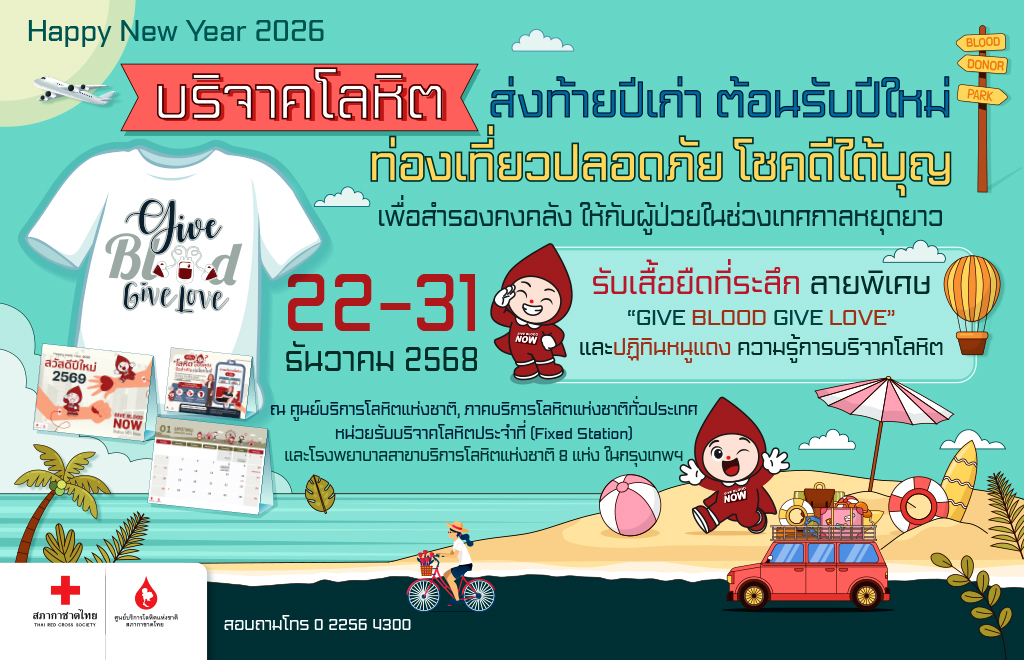 ศูนย์บริการโลหิตแห่งชาติ สภากาชาดไทย ชวนประชาชนเสริมบุญสุดปัง! ก่อนเดินทาง บริจาคเลือดส่งท้ายปี พบความโชคดีตลอดปีใหม่ 2569 ในโครงการ“บริจาคโลหิต ส่งท้ายปีเก่าต้อนรับปีใหม่ ท่องเที่ยวปลอดภัย โชคดีได้บุญ”วันที่ 22 – 31 ธันวาคม 2568 ณ ศูนย์บริการโลหิตแห่งชาติ หน่วยรับบริจาคโลหิตประจำที่ (Fixed Station) 7 แห่ง ภาคบริการโลหิตแห่งชาติ 12 แห่ง ทั่วประเทศ และโรงพยาบาลสาขาบริการโลหิต 8 แห่ง ในกรุงเทพ ฯ ผู้บริจาคโลหิตจะได้รับเสื้อยืด “GIVE BLOOD GIVE LOVE” และปฏิทิน“Give Blood Now – ให้เลือด ให้ได้ ให้เลย” เป็นที่ระลึก