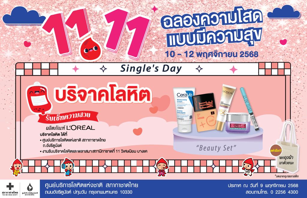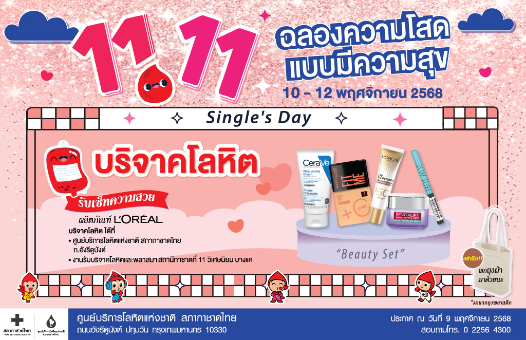 10 – 12 พฤศจิกายน 2568 ศูนย์บริการโลหิตแห่งชาติ สภากาชาดไทย ชวนคนโสดสุขภาพดี ฉลองวันคนโสดกับกิจกรรม “Single’s Day ชวนคนโสดมาเป็นฮีโร่” เพื่อส่งต่อสิ่งดีๆให้สังคม ด้วยการบริจาคโลหิตช่วยเหลือผู้ป่วย