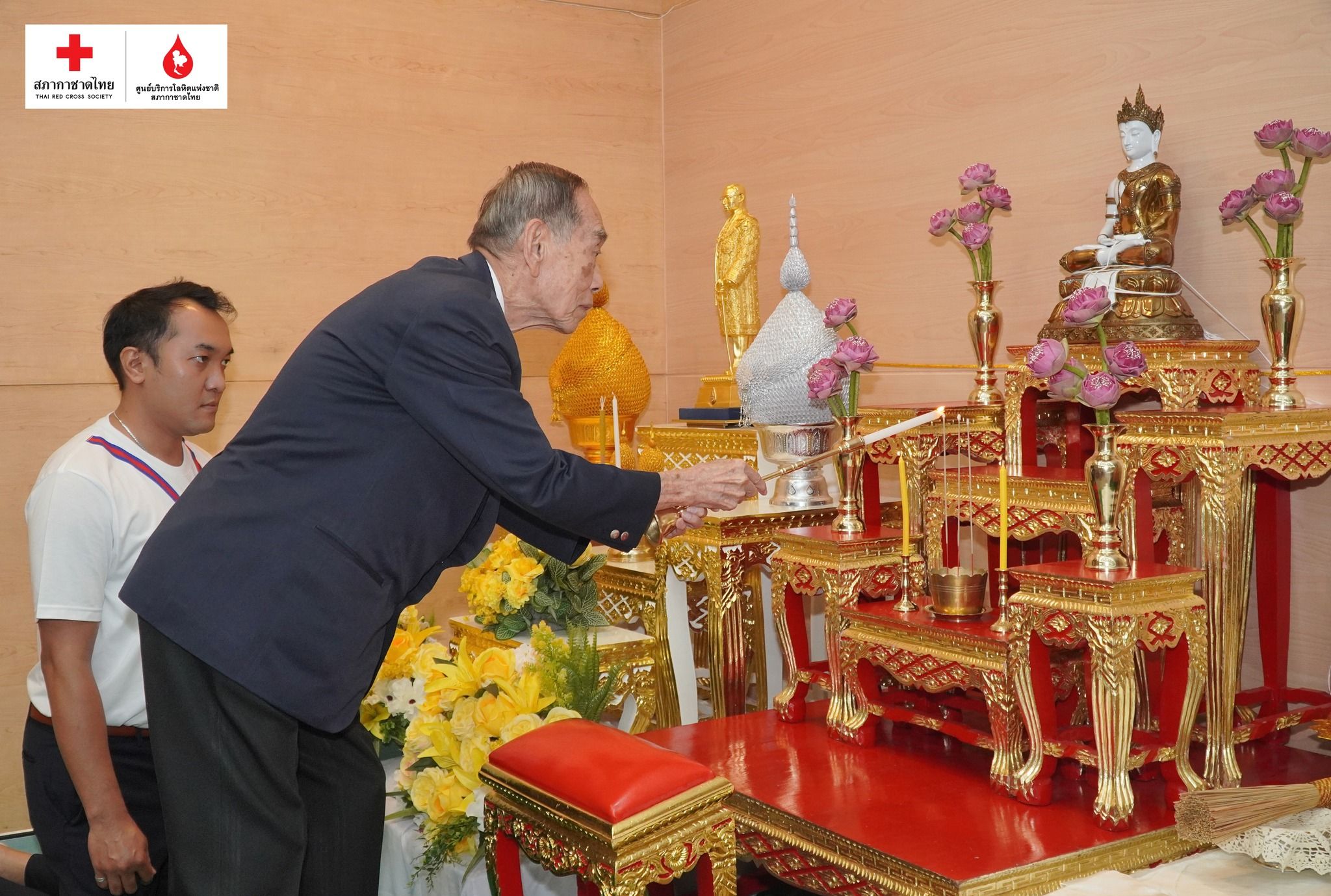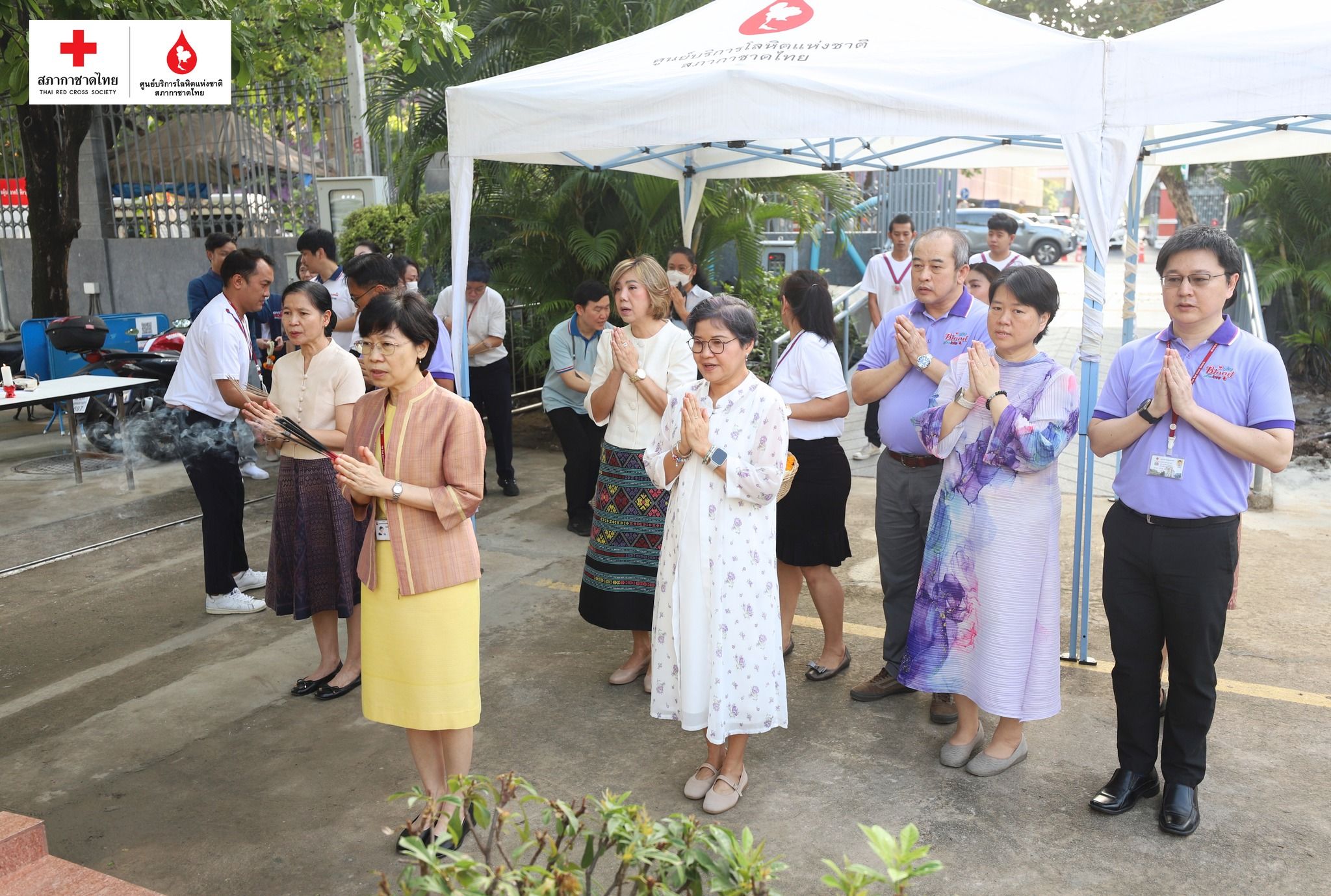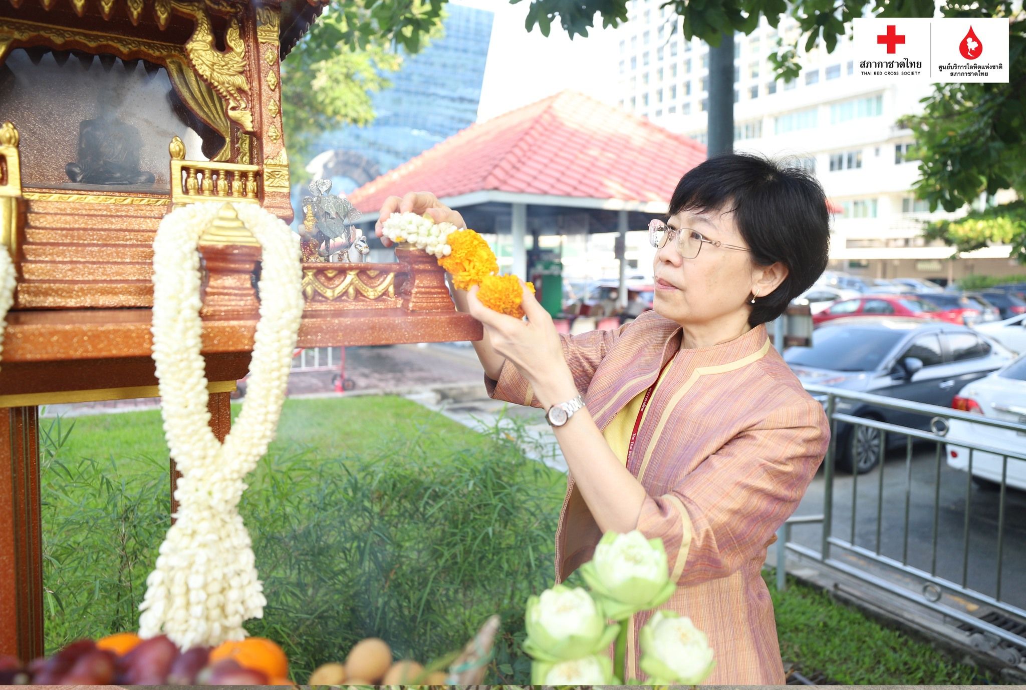 จากนั้น ร่วมสักการะบูชาบรมครูแพทย์ชีวกโกมารภัจจ์ และศาลพระภูมิ ซึ่งเป็นเสมือนศูนย์รวมใจของเจ้าหน้าที่ศูนย์บริการโลหิตแห่งชาติ เพื่อความเป็นสิริมงคล ณ บริเวณด้านหน้า ศูนย์บริการโลหิตแห่งชาติ สภากาชาดไทย ถ.อังรีดูนังต์