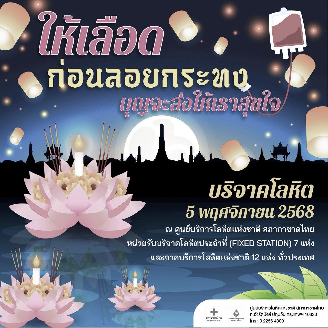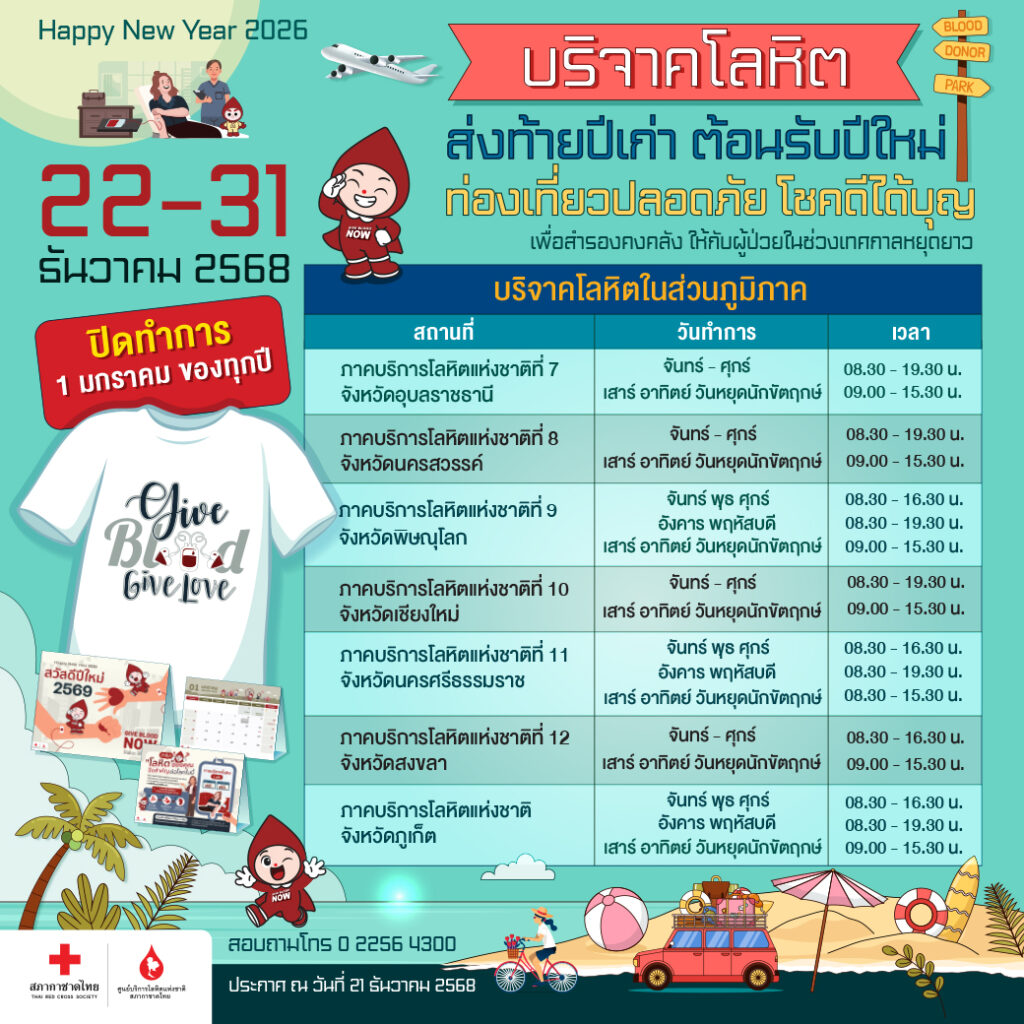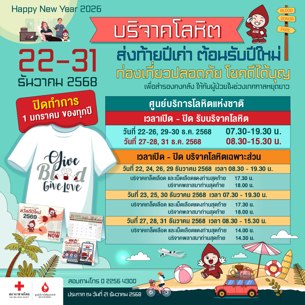 ศูนย์บริการโลหิตแห่งชาติ สภากาชาดไทย ชวนประชาชนเสริมบุญสุดปัง! ก่อนเดินทาง บริจาคเลือดส่งท้ายปี พบความโชคดีตลอดปีใหม่ 2569 ในโครงการ“บริจาคโลหิต ส่งท้ายปีเก่าต้อนรับปีใหม่ ท่องเที่ยวปลอดภัย โชคดีได้บุญ”วันที่ 22 – 31 ธันวาคม 2568 ณ ศูนย์บริการโลหิตแห่งชาติ หน่วยรับบริจาคโลหิตประจำที่ (Fixed Station) 7 แห่ง ภาคบริการโลหิตแห่งชาติ 12 แห่ง ทั่วประเทศ และโรงพยาบาลสาขาบริการโลหิต 8 แห่ง ในกรุงเทพ ฯ ผู้บริจาคโลหิตจะได้รับเสื้อยืด “GIVE BLOOD GIVE LOVE” และปฏิทิน“Give Blood Now – ให้เลือด ให้ได้ ให้เลย” เป็นที่ระลึก