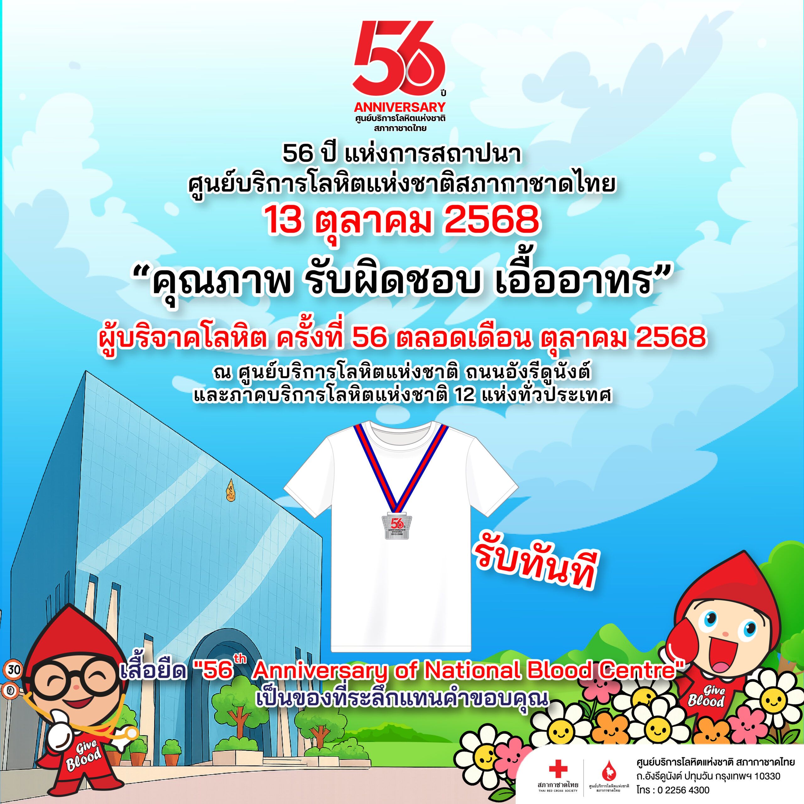 สำหรับผู้บริจาคโลหิตครบ 56 ครั้ง ภายในเดือนตุลาคม 2568 ที่บริจาค ณ หน่วยรับบริจาคโลหิตประจำที่ (Fixed Station) 7 แห่ง ภาคบริการโลหิตแห่งชาติ 12 แห่งทั่วประเทศ และหน่วยรับบริจาคโลหิตเคลื่อนที่ในกรุงเทพฯ และปริมณฑล เฉพาะหน่วยของศูนย์บริการโลหิตแห่งชาติ จะจัดส่งเสื้อยืดที่ระลึกให้ในภายหลัง ทั้งนี้ ในวันศุกร์ที่ 10 ตุลาคม 2568 ศูนย์บริการโลหิตแห่งชาติ ได้จัดพิธีบำเพ็ญกุศลอุทิศถวายแด่พระบาทสมเด็จพระบรมชนกาธิเบศร มหาภูมิพลอดุลยเดชมหาราช บรมนาถบพิตร เนื่องในโอกาส “วันนวมินทรมหาราช” และในวาระ 56 ปี แห่งการสถาปนาศูนย์บริการโลหิตแห่งชาติ สภากาชาดไทย ณ ศูนย์บริการโลหิตแห่งชาติ สภากาชาดไทย